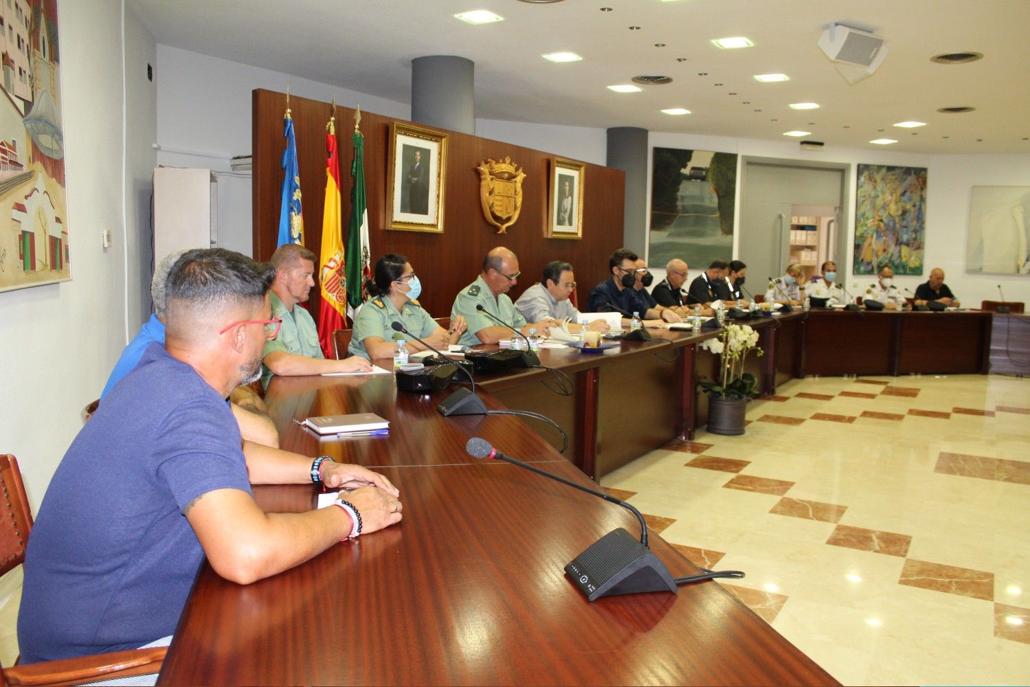 Policía Local, Guardia Civil, Policía Nacional y Autonómica, Bomberos y Protección Civil, junto al subdelegado del gobierno, el alcalde de Novelda y los concejales de Fiestas, José María Chacón, y Seguridad Ciudadana, Ximo Mira, han participado en una reunión de trabajo cuyo objetivo, como ha indicado Fran Martínez, ha sido “actualizar el protocolo de actuación en materia de seguridad por los cambios de fechas en la programación de fiestas, trazar los planes operativos coordinados y repasar todos los dispositivos referentes a las mismas”.