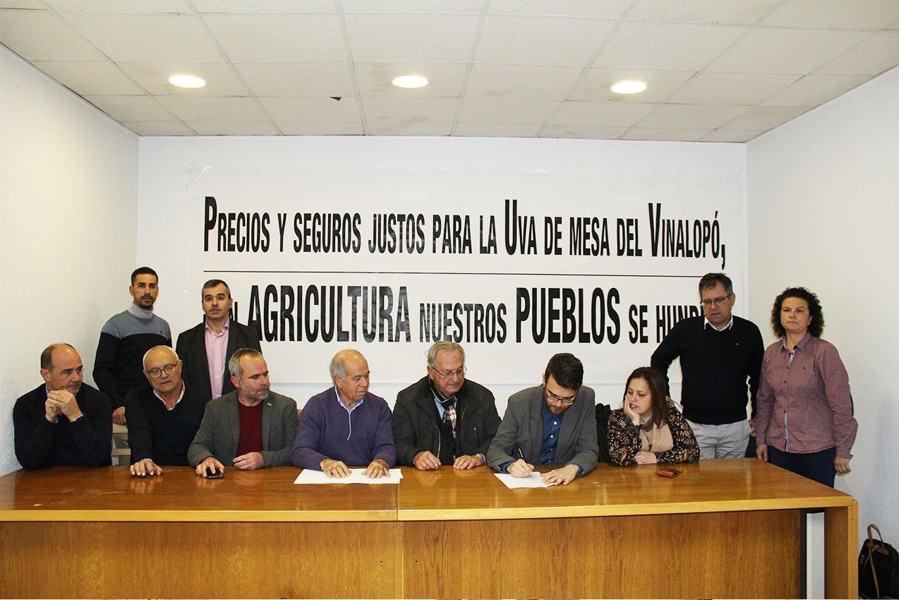 La sede de la Coorperativa Agraria de Monforte del Cid ha sido el escenario de la firma de este documento por parte de los alcaldes de Novelda, Fran Martínez; Aspe, Antonio Puerto; Monforte del Cid, Mª Dolores Berenguer; La Romana, Nelson Romero; Agost, Juan José Castelló; Hondón de las Nieves, Carmen Sellés y Hondón de los Frailes, Eleuterio Jover, texto también rubricado por el Presidente del Consejo Regulador de la Denominación de Origen, José Bernabeu, los secretarios generales de Asaja, Eladio Aniorte, La Unió, Carles Peris, así como por representantes de las cooperativas y de la Federación Provincial de Empresarios Hortofrutícolas, en el que se solicita la intervención del Ministerio de Agricultura ante la subida “inasumible y desproporcionada” del precio del seguro agrario por parte de Agroseguro, que en 2020 se incrementa en casi un 9% en una escalada alcista que se suma al diez por ciento de aumento del pasado año.