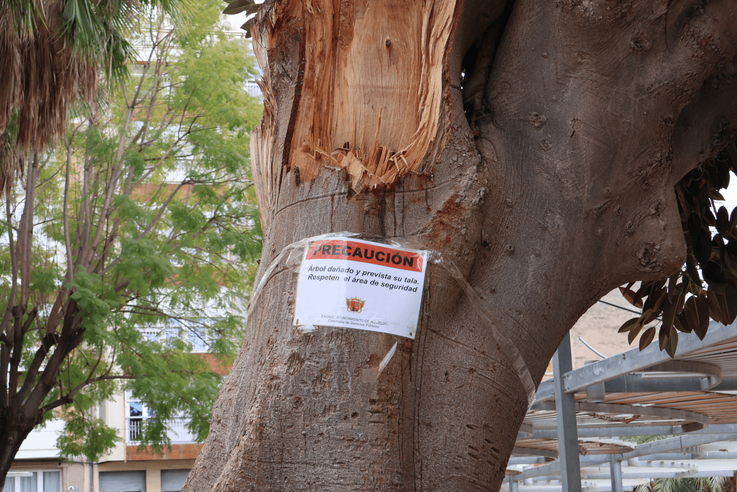 El Ayuntamiento, a través de una empresa especializada en poda de arbolado, ha iniciado los trabajos de tala de un ficus en la Glorieta y un pino de grandes dimensiones en el Paseo de Los Molinos, ejemplares que presentaban, según los informes técnicos, un alto riesgo de caída por graves daños estructurales.
