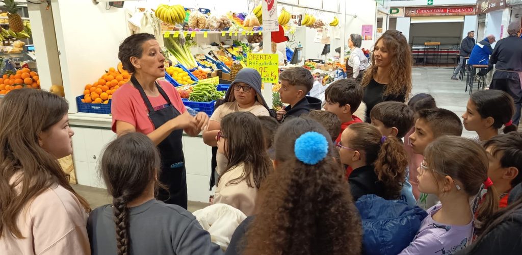Durante las sesiones, el alumnado participa en una visita guiada por los distintos establecimientos del mercado, donde se abordan contenidos relacionados con los grupos de alimentos, sus propiedades nutricionales, métodos de producción, temporalidad y su incorporación a la dieta diaria. Asimismo, se pone en valor el papel del comercio local y la relevancia de apoyar el consumo de proximidad.