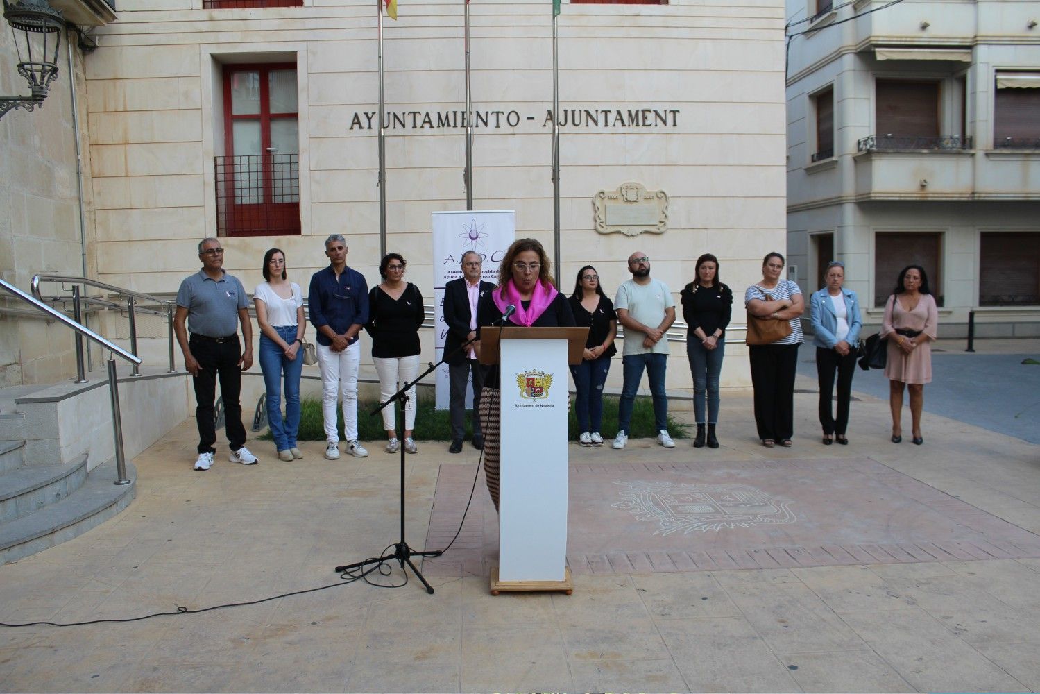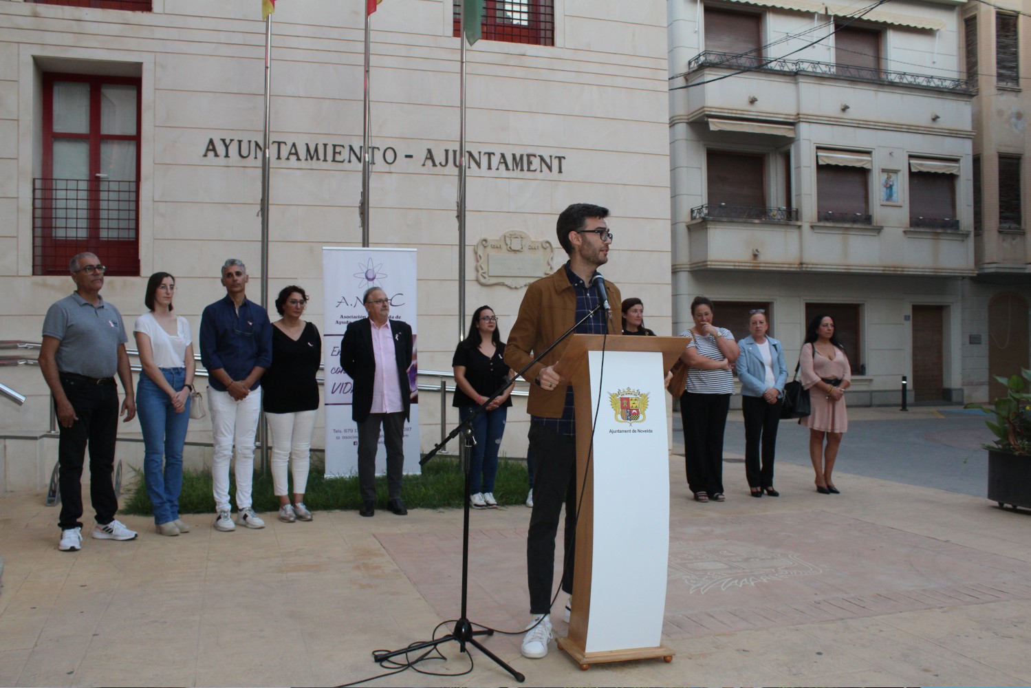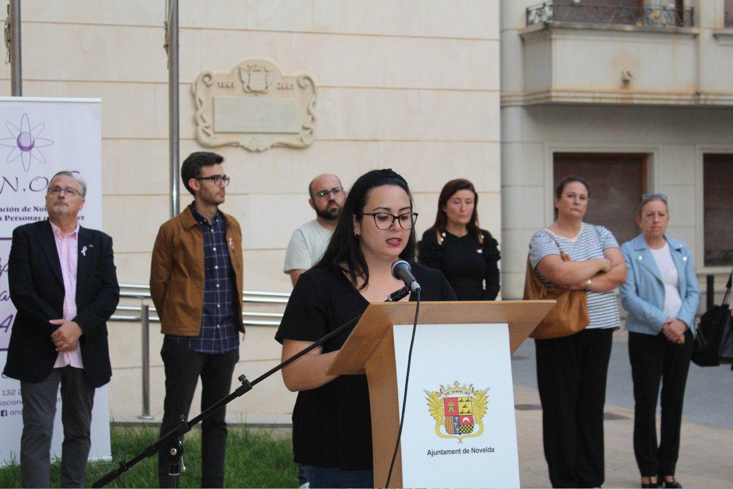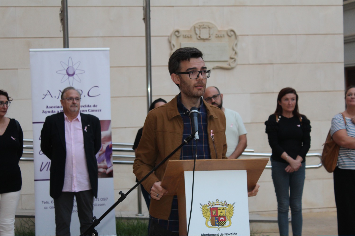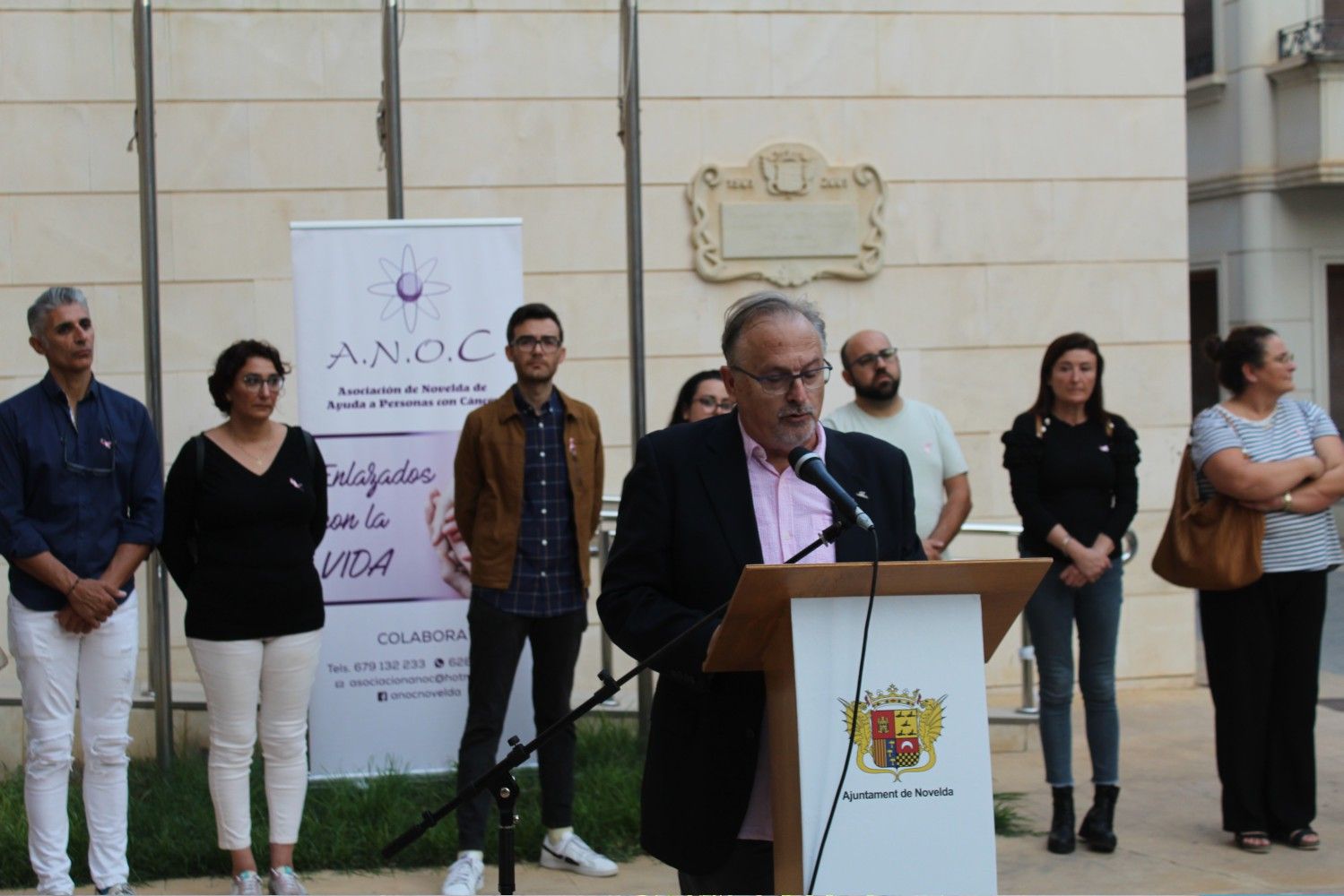 Un importante número de personas se concentró en los soportales del Ayuntamiento donde, junto a representantes de la corporación municipal, participó del acto central del programa elaborado por la Asociación de Ayuda a Personas con Cáncer de Novelda (ANOC) para celebrar esta jornada en la que se reivindicó que la administración incremente la inversión en investigación.
