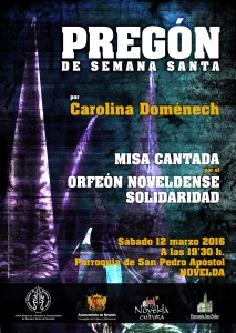Sábado día 12, a las 19:30 h., en la Iglesia P. de San Pedro. Pregón de Semana Santa, a cargo de Carolina Doménech Belda. A Continuación, Misa Cantada a cargo del Orfeón Noveldense Solidadridad. Organiza: Junta Mayor de Cofradías y Hermandades de Semana Santa. Colabora: Concejalía de Cultura y Patrimonio.
