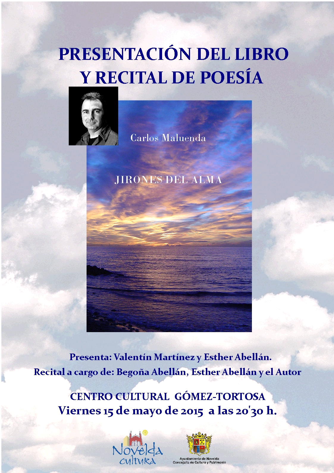 Viernes día 15, a las 20’30 h., en el Centro Cultural Gómez-Tortosa. Presentación del libro y recital de poesía “Jirones del alma” de Carlos Maluenda Gramaje. Presenta: Valentín Martínez y Esther Abellán. Recital a cargo de Begoña Abellán, Esther Abellán y el Autor.
