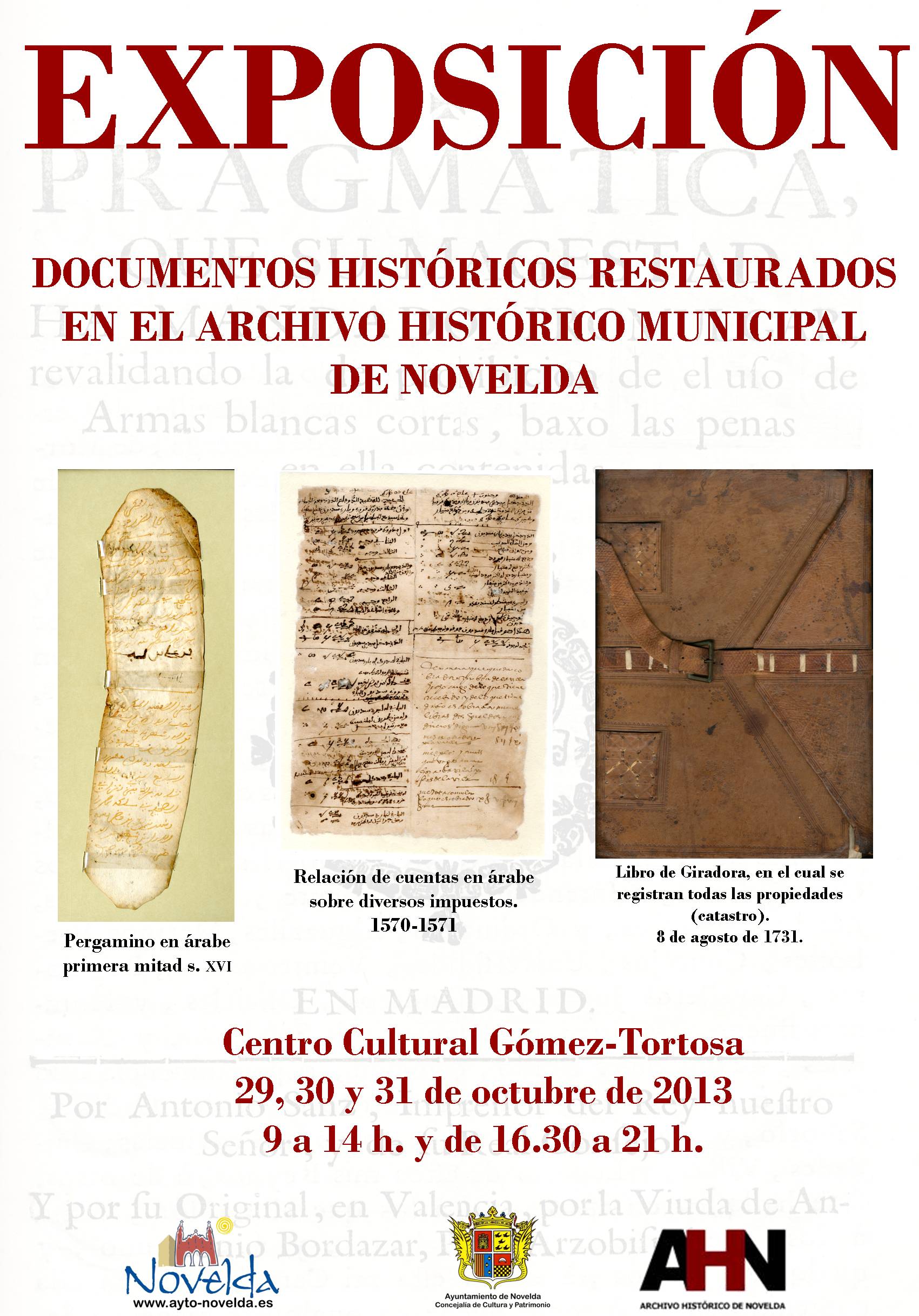 Del 29 al 31 de octubre, en el Centro Cultural Gómez-Tortosa. Presentación Pública y Exposición “Documentos históricos restaurados en el Archivo Histórico Municipal de Novelda”. Horario de visitas: de 9 a 14 h. y de 16.30 a 21 h.