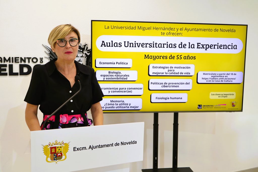 En el caso de Novelda las Aulas Universitarias, coordinadas por la profesora Nuria Reche, ofrecen diferentes cursos de formación, impartidos por profesores especializados y centrados en materias como las políticas de prevención del cibercrimen, economía política, fisiología humana, memoria, estrategias del motivación o biología, espacios naturales y sostenibilidad. Un total de siete cursos con los que se pretende, fundamentalmente, permitir a las personas mayores de 55 años participar en procesos formativos y prácticos que buscan impulsar un envejecimiento activo y saludable.