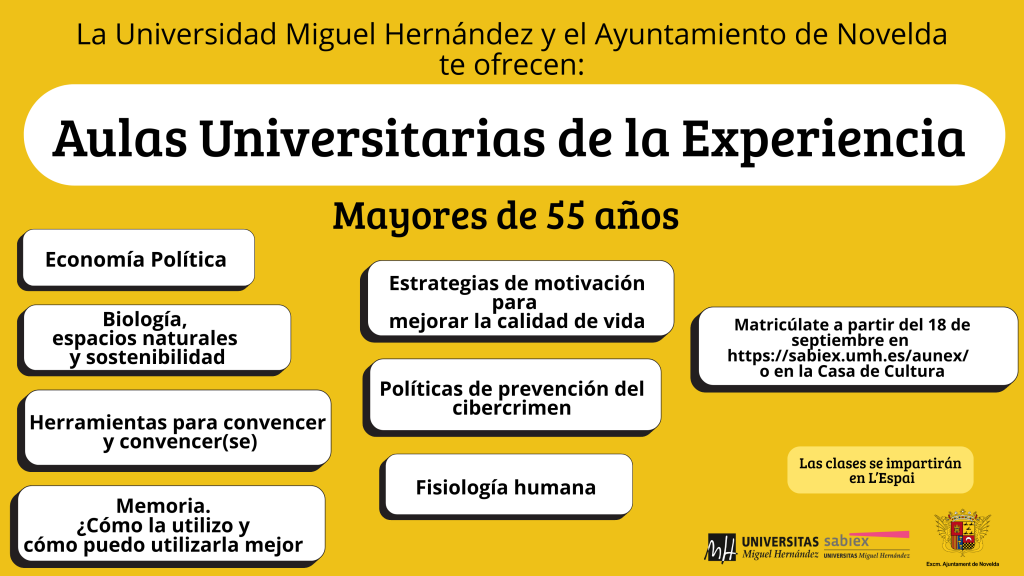 Las Aulas Universitarias de la Experiencia de la UMH comienzan su andadura en Novelda con una oferta de cursos, destinados a mayores de 55 años, que se desarrollarán en L’Espai a partir del 13 de octubre y para los que se podrá realizar la matrícula desde el 18 de septiembre en la página web del programa Sabiex (https://sabiex.umh.es/aunex/) y también en la biblioteca de la Casa de Cultura.