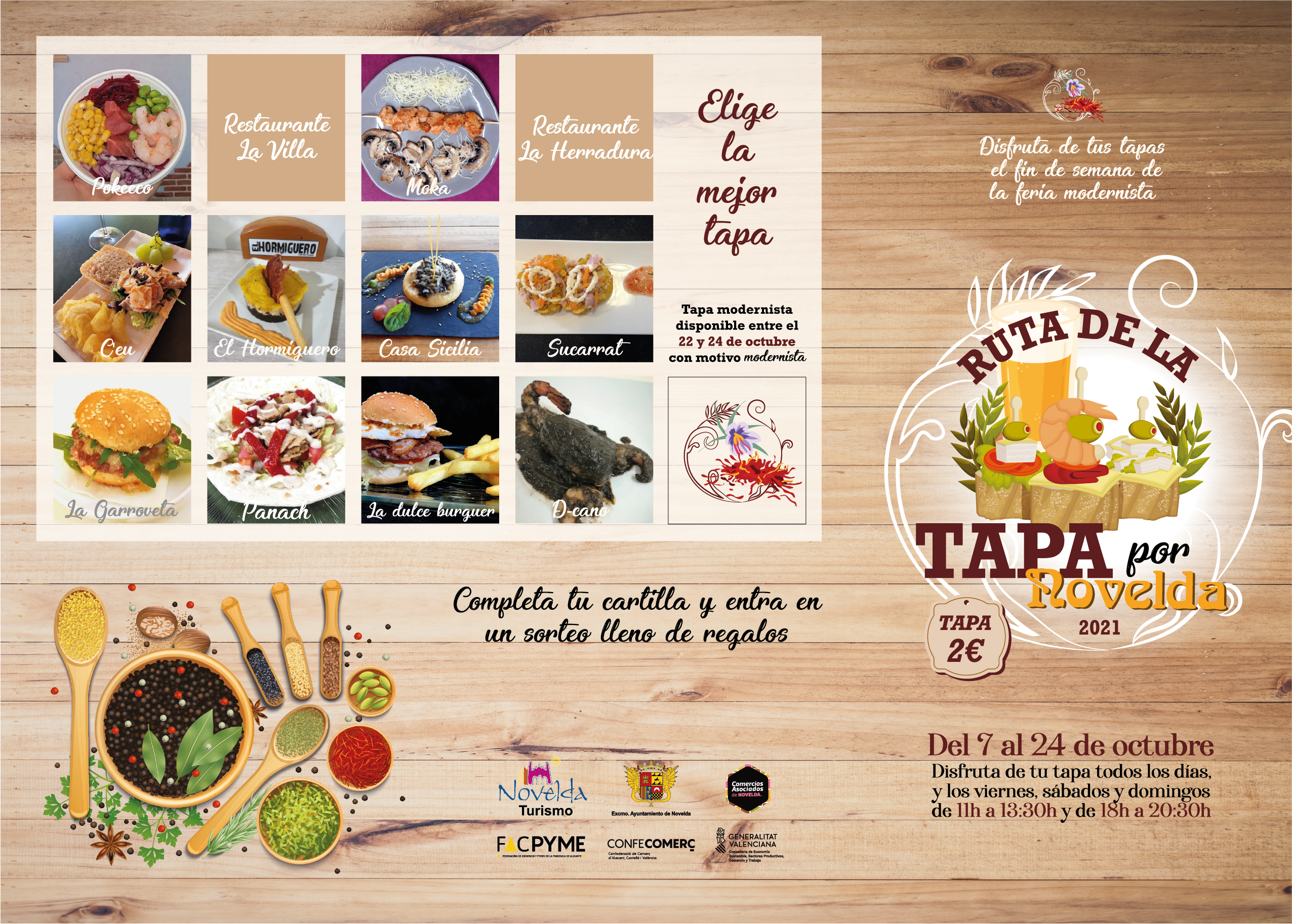 La Ruta de Tapas 2021 contará con la participación de doce establecimientos hosteleros de la ciudad (D-Cano, Panach, La Villa, La Herradura, La Dulce Burguer, Sucarrat, El Hormiguero, Pokeeco, Moka, C’EU, La Garroveta y Casa Sicilia) que ofrecerán tapas gourmet al precio de 2 euros más bebida. Además los participantes obtendrán por la consumición de cada tapa un sello acreditativo que recogerán en una cartilla, en la que con un mínimo de siete sellos, uno de ellos recogido durante el fin de semana de Novelda Modernista, los clientes podrán participar en un sorteo de 5 tarjetas Regala Novelda de 50 euros.