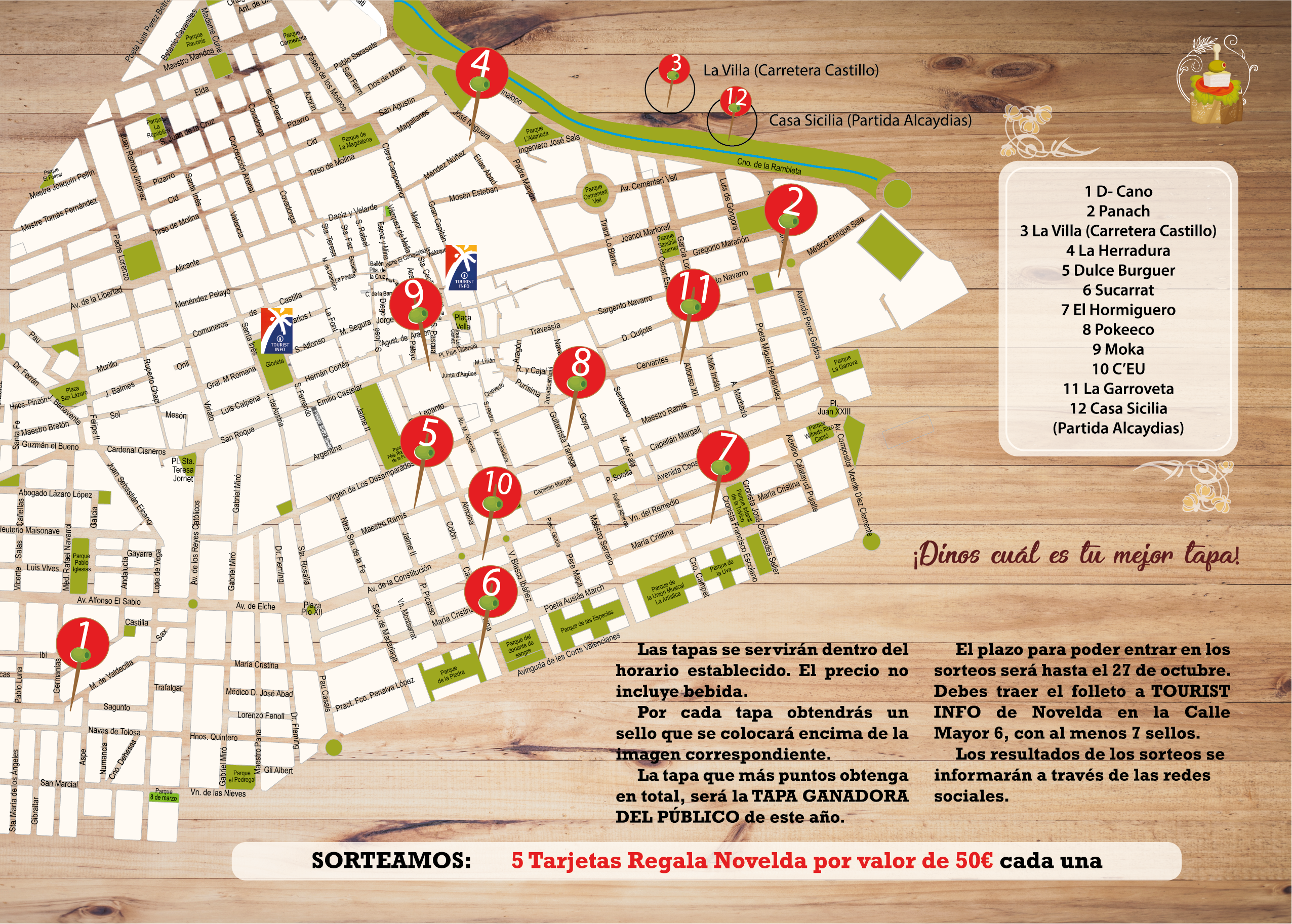 Para poder participar en el sorteo de las tarjetas Regala Novelda se deberá entregar la cartilla con los sellos en la Tourist Info de Novelda, calle Mayor número 6, hasta el 27 de octubre.