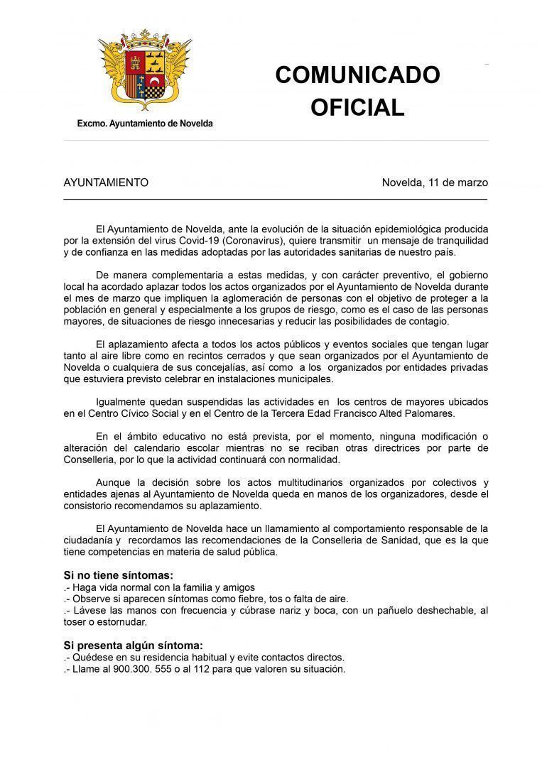 De manera complementaria a estas medidas, y con carácter preventivo, el gobierno local ha acordado aplazar todos los actos organizados por el Ayuntamiento de Novelda durante el mes de marzo que impliquen la aglomeración de personas con el objetivo de proteger a la población en general y especialmente a los grupos de riesgo, como es el caso de las personas mayores, de situaciones de riesgo innecesarias y reducir las posibilidades de contagio.
