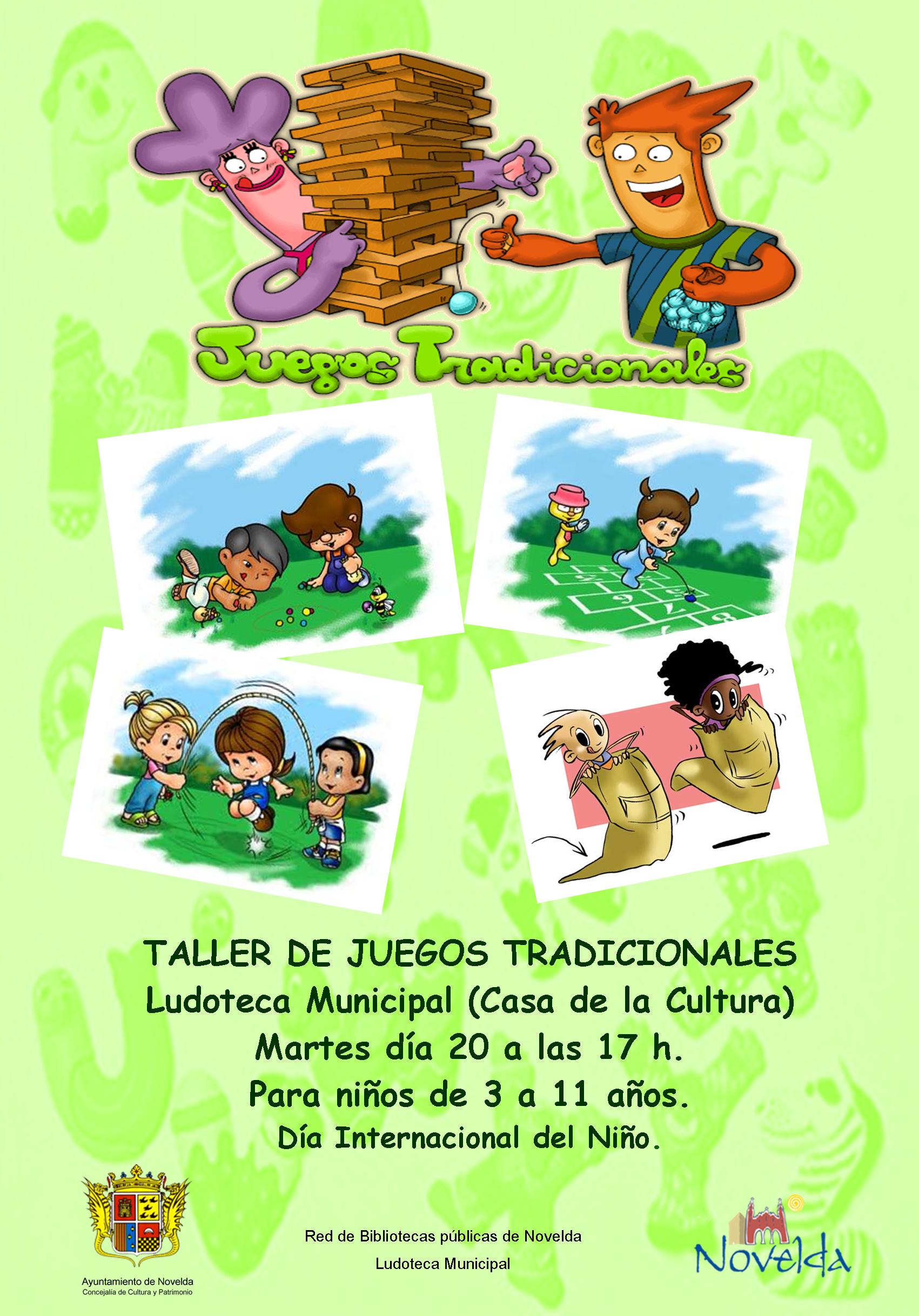 Martes día 20, a las 17 h., en la Ludoteca Municipal (Casa de Cultura). Con motivo del día Internacional del Niño. Taller de juegos tradicionales, dirigido a niños entre 3 y 11 años.