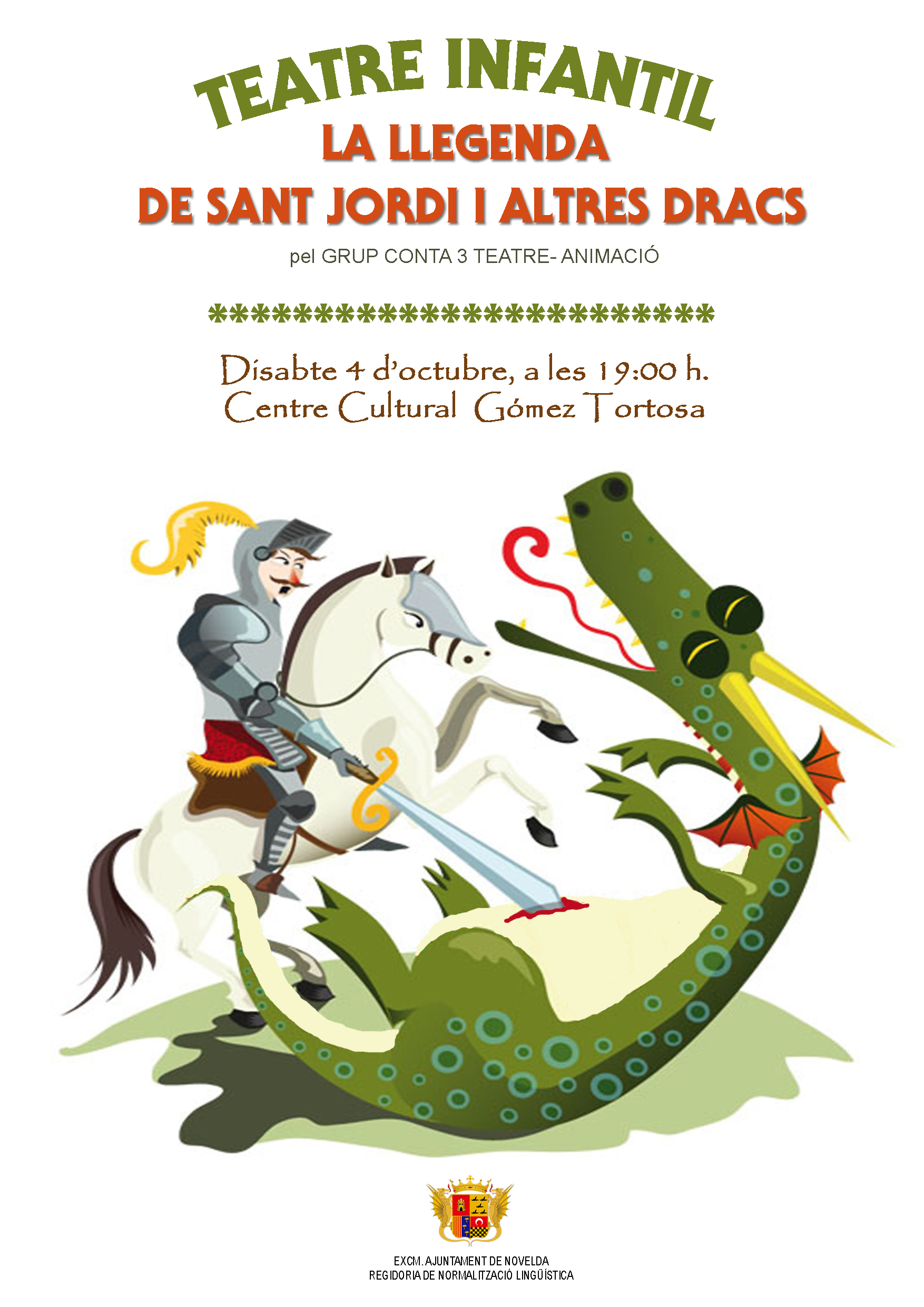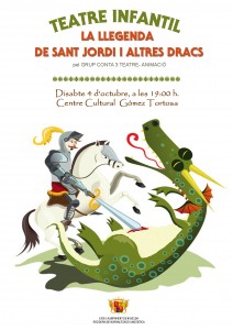 Sábado día 4, a las 19 h., en el Centro Cultural Gómez-Tortosa. “II setmana del valencià” Teatre infantil “La llegenda de Sant Jordi i altres dracs” a cargo del grupo “Conta 3 teatre-animació”.